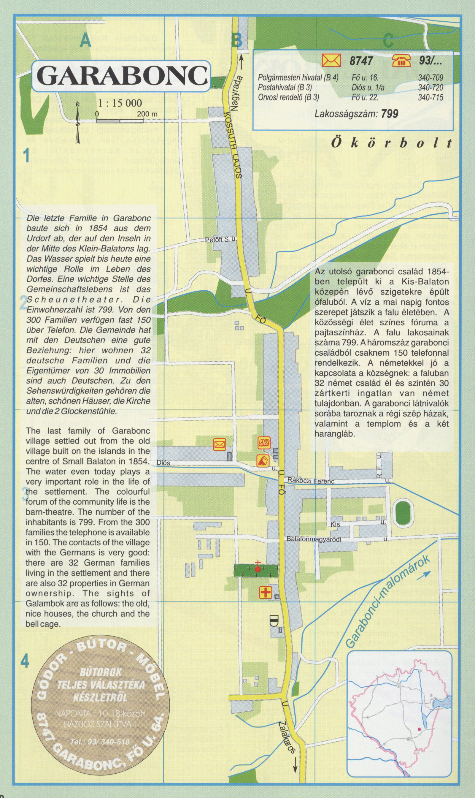 Nyilvános 2572 | 9619 | Garabonc | Az utolsó garabonci család 1854-ben települt ki a Kis-Balaton közepén lévő szigetekre épült ófaluból. A víz a mai napig fontos szerepet játszik a falu életében. A közösségi élet színes fóruma a pajtaszínház. A falu lakosainak száma 799. A háromszáz garabonci családból csaknem 150 telefonnal rendelkezik. A németekkel jó a kapcsolata a községnek: a faluban 32 német család él és szintén 30 zártkerti ingatlan van német tulajdonban. A garabonci látnivalók sorába taroznak a régi szép házak, valamint a templom és a két harangláb. Die letzte Familie in Garabonc baute sich in 1854 aus dem Urdorf ab, der auf den Inseln in der Mitte des Klein-Balatons lag. Das Wasser spielt bis heute eine wichtige Rolle im Leben des Dorfes. Eine wichtige Stelle des Gemeinschaftslebens ist das Scheunetheater. Die Einwohnerzahl ist 799. Von den 300 Familien verfügen fast 150 über Telefon. Die Gemeinde hat mit den Deutschen eine gute Beziehung: hier wohnen 32 deutsche Familien und die Eigentümer von 30 Immobilien sind auch Deutschen. Zu den Sehenswürdigkeiten gehören die alten, schönen Häuser, die Kirche und die 2 Glockenstühle. The last family of Garabonc village settled out from the old village built on the islands in the centre of Small Balaton in 1854. The water even today plays a very important role in the life of the settlement. The colourful forum of the community life is the barn-theatre. The number of the inhabitants is 799. From the 300 families the telephone is available in 150. The contacts of the village with the Germans is very good: there are 32 German families living in the settlement and there are also 32 properties in German ownership. The sights of Galambok are as follows: the old, nice houses, the church and the bell cage. A részlet a következő kiadványból származik/Die Teile stammen vom volgenden Buch/This text came from the following book: Cím/Titel/Title: Zala megye településeinek atlasza - 257 település részletes térképe/Atlas der Komitat Zala - 257 Detailte Siedlungskarten/Zala county's Atlas - 257 settlement maps. Közreműködő/contributor: Lackner László (1943) (fotó) Kiadás/Ausgabe/Publisher: Gyula : HISZI-MAP, 1997 Sorozat/Serie/Series: Indulástól - megérkezésig... ETO: 912(439.121-2) ; 908.439.121 Cutter: Z 19 ISBN: 963-610-025-4 Oldalszám/Seiten/Pages: 323, 81 p. Megjegyzés/Note: Lezárva/Abgeschlossen am/Closed am: 1997. máj. 30. |